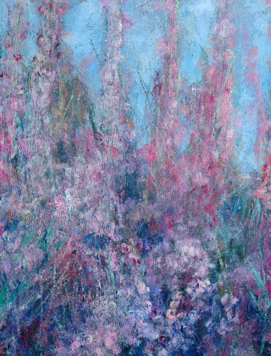 Hollyhocks 13 x 10 inches Acrylic on Canvas, Mixed Media $350