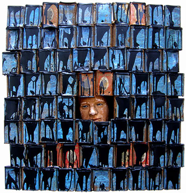 Let Him Out 33 x 32 x 5 inches Antique tins, mannequin, paint on board 2006 $7500