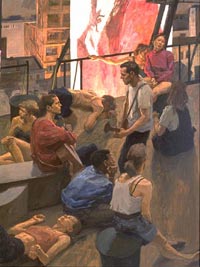 September 14 - October 12, 2002 Yu Ji's paintings explore the enigmatic, often tenuous relationships between people. Figures share the cramped spaces of urban landscape, tight rooms, the sweltering closeness of city life; figures recline inside a seemingly self-imposed dystopia. A divine sense of isolation informs Ji's paintings which are eloquent figurative compositions in oil painted in rich, muted colors. |