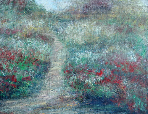 Geranium Path 9 x 12 inches Acrylic on Canvas, Mixed Media $325