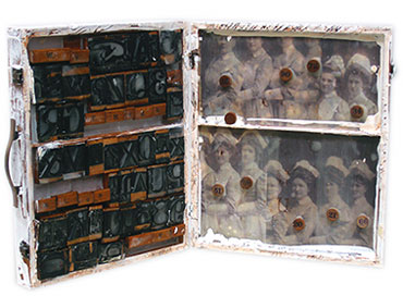 Think Alone 14.5 x 24 x 3 inches print blocks, bingo pieces, wood box 2005 $2,500