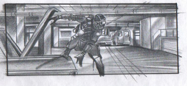 "Entrapment" storyboard 4 x 9 1/2 inches Black Prismacolor pencil on tracing paper