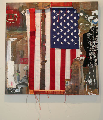 War...the fabric of our lives. 30 x 30 inches Acrylic, fabric, photos, paper, dog tags, chains, cross, dollar bill, American flag, band-aid $2076
