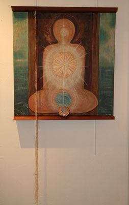 Suukya’ 32 x 30 x 4.5 inches Acrylic, wood, turquoise, string, gold leaf, Hopi Indian pot $2500 SOLD